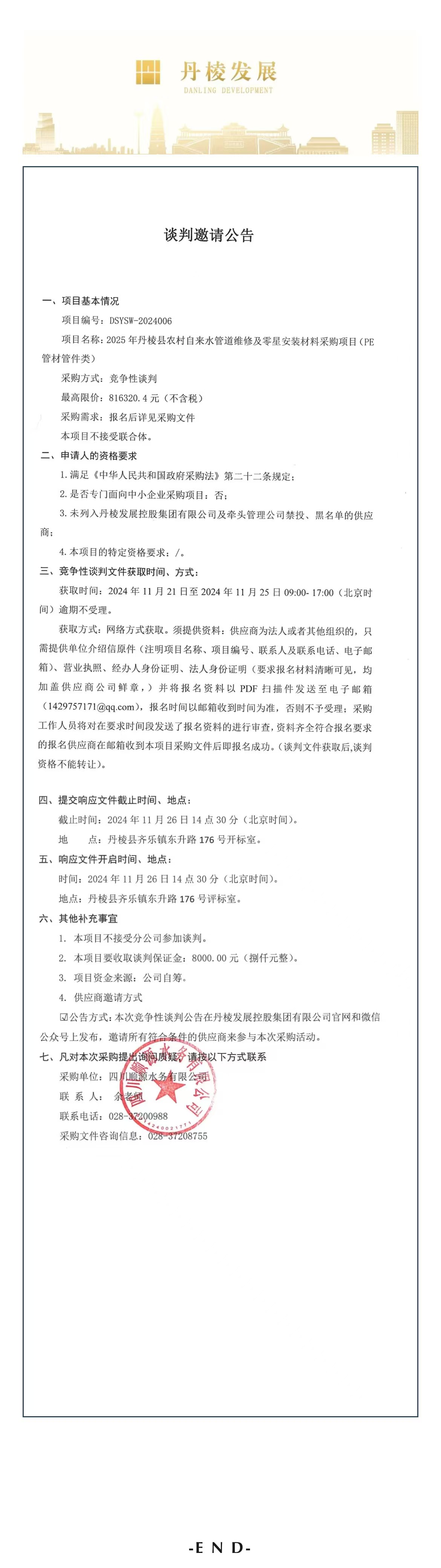 2025年丹棱縣農村自來水管道維修及零星安裝材料采購項目(PE管材管件類)談判邀請公告