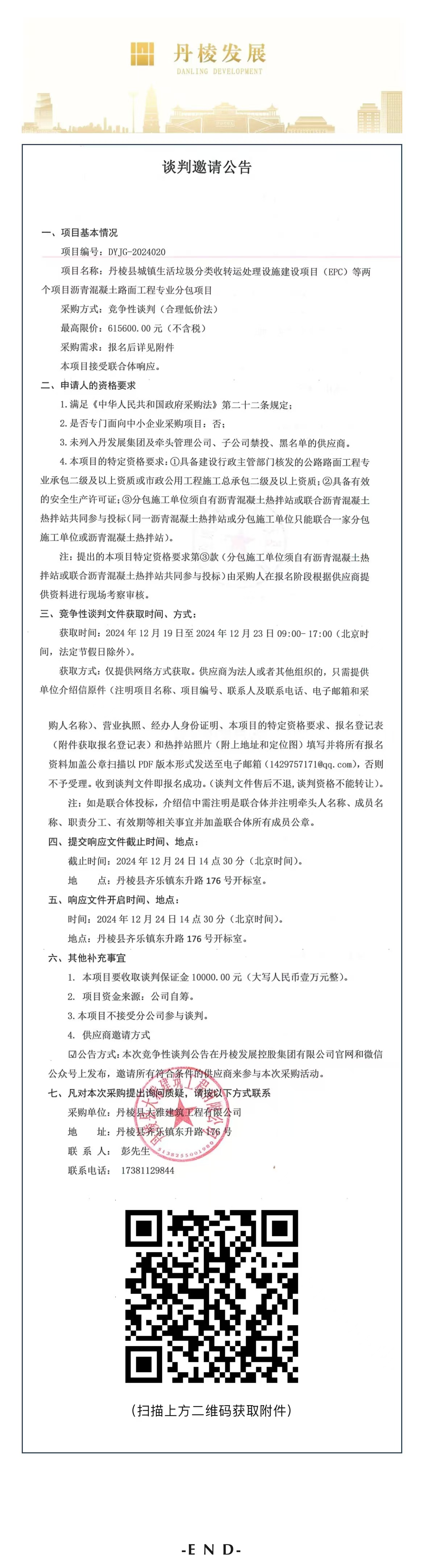 丹棱縣城鎮(zhèn)生活垃圾分類收轉(zhuǎn)運處理設(shè)施建設(shè)項目(EPC)等兩個項目瀝青混凝土路面工程專業(yè)分包項目談判邀請公告