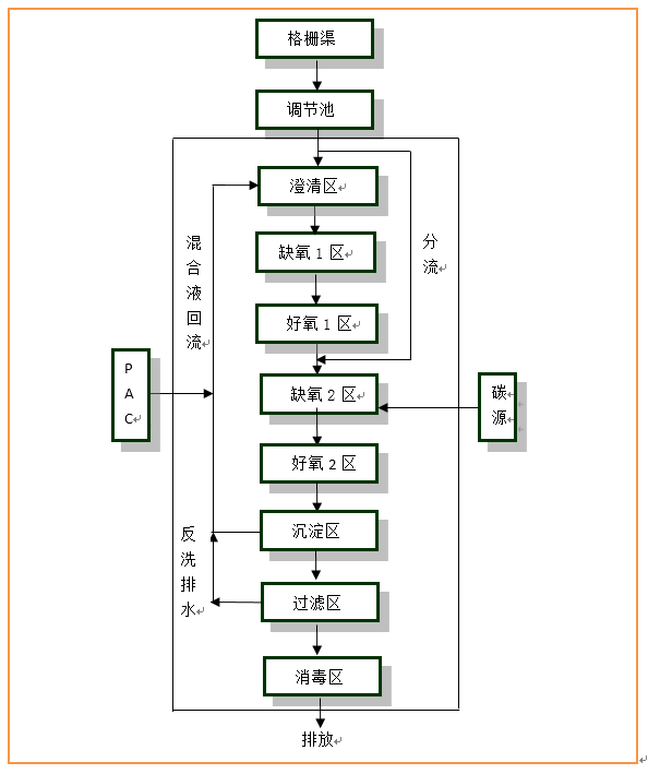 污水首先通過格柵去除漂浮物等較大垃圾,減少污水中頭發(fā)絲、絨狀絮體等細(xì)小漂浮物進(jìn)入后端生化處理系統(tǒng)。格柵渠設(shè)置在調(diào)節(jié)池內(nèi)。通過格柵攔截污水中的纖維狀及較大的顆粒狀雜質(zhì)。調(diào)節(jié)用以均衡水量、水質(zhì),內(nèi)置潛污泵及回流措施,以保證一定的額定流量提升至污水處理設(shè)備。