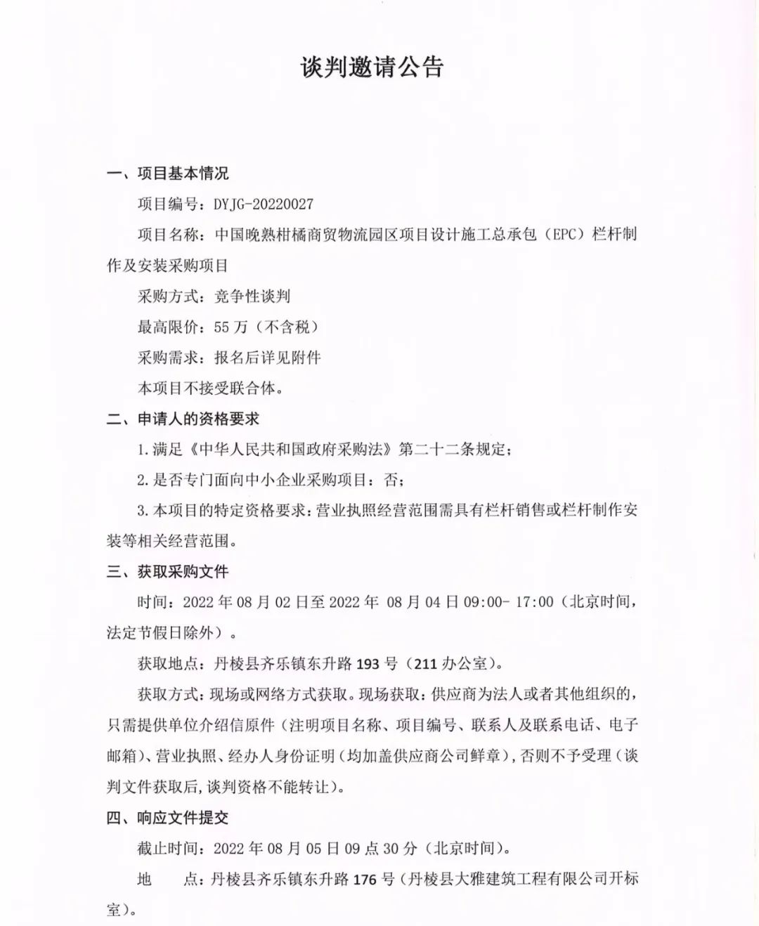 中國晚熟柑橘商貿(mào)物流園區(qū)項目設計施工總承包(EPC)欄桿制作及安裝采購項目談判邀請公告