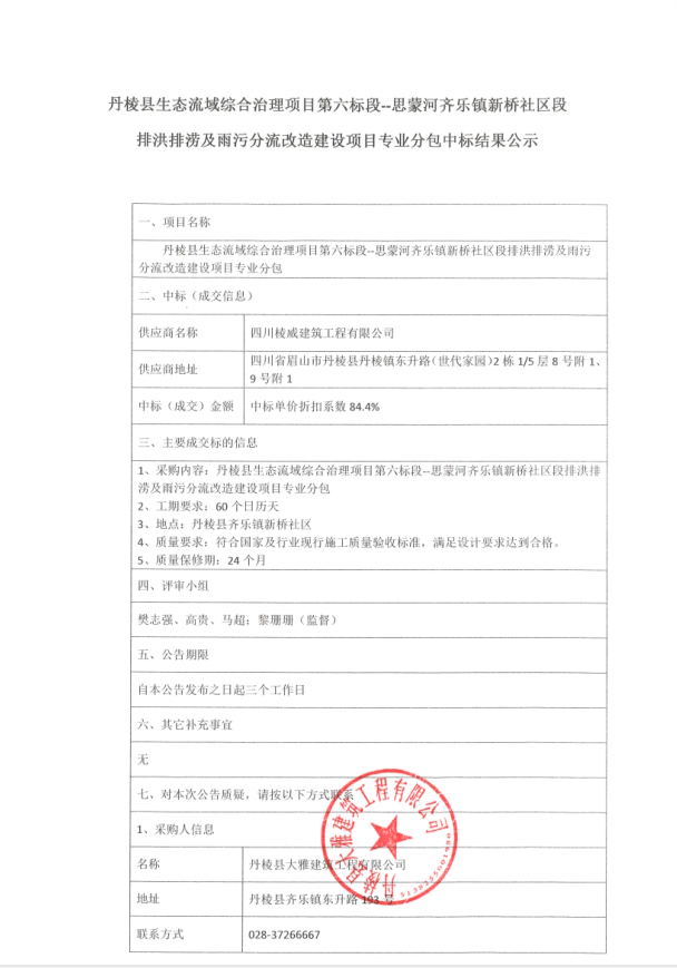 【大雅建筑公司】丹棱縣生態(tài)流域綜合治理項(xiàng)目第六標(biāo)段—思蒙河齊樂(lè)鎮(zhèn)新橋社區(qū)段排洪排澇及雨污分流改造建設(shè)項(xiàng)目專業(yè)分包中標(biāo)結(jié)果公示