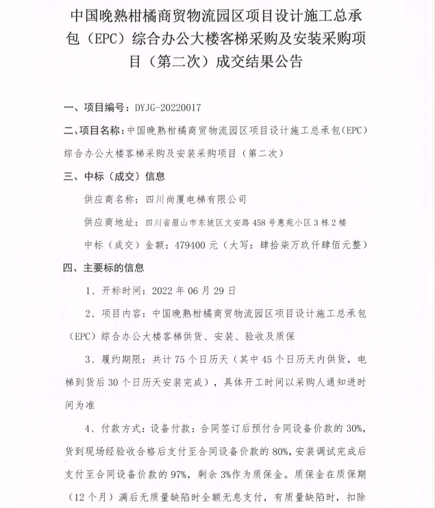 中國(guó)晚熟柑橘商貿(mào)物流園區(qū)項(xiàng)目設(shè)計(jì)施工總承包(EPC)綜合辦公大樓客梯采購(gòu)及安裝采購(gòu)項(xiàng)目(第二次)成交結(jié)果公告