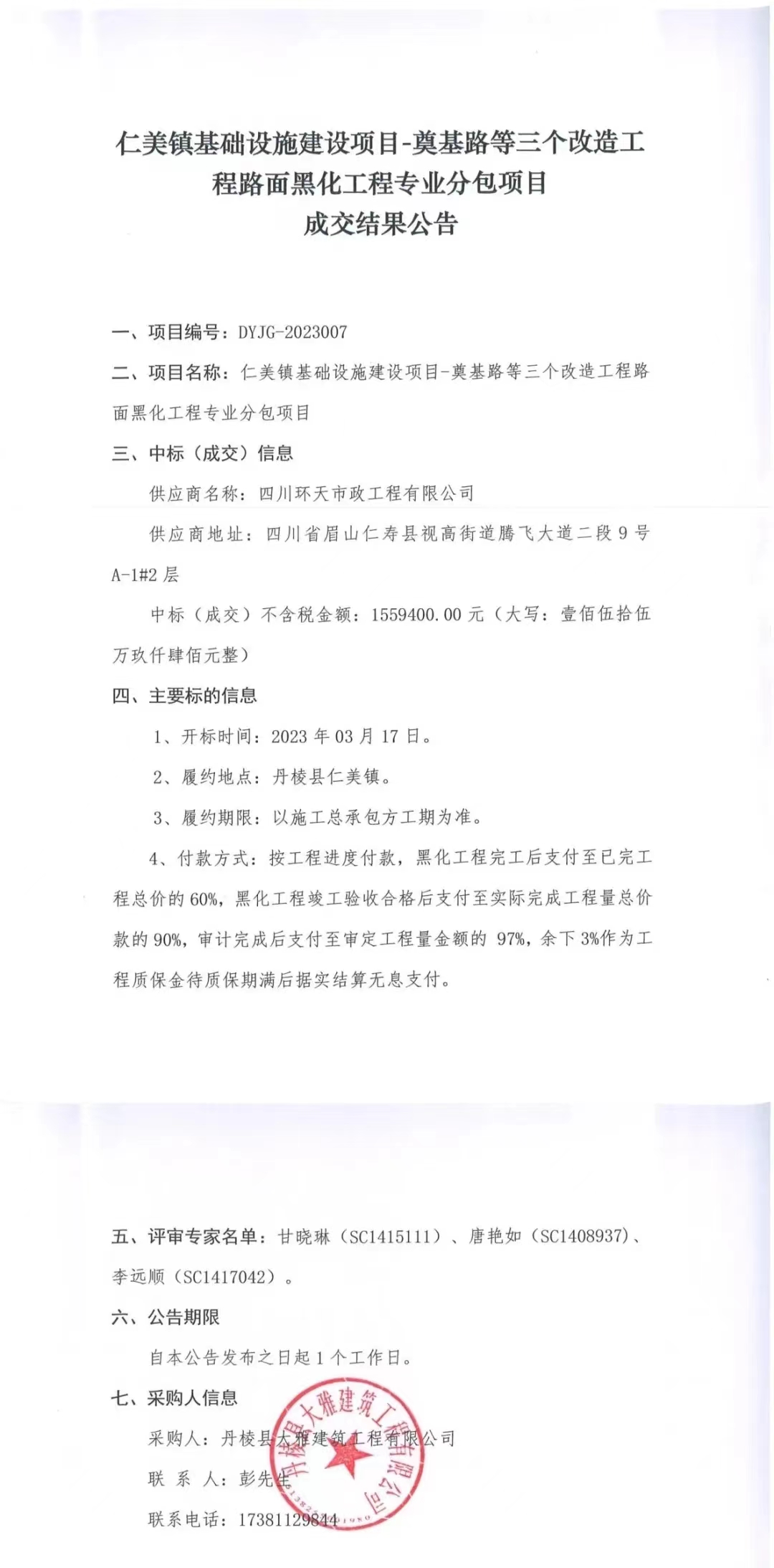 仁美鎮(zhèn)基礎設施建設項目-奠基路等三個改造工程路面黑化工程專業(yè)分包項目成交結果公告