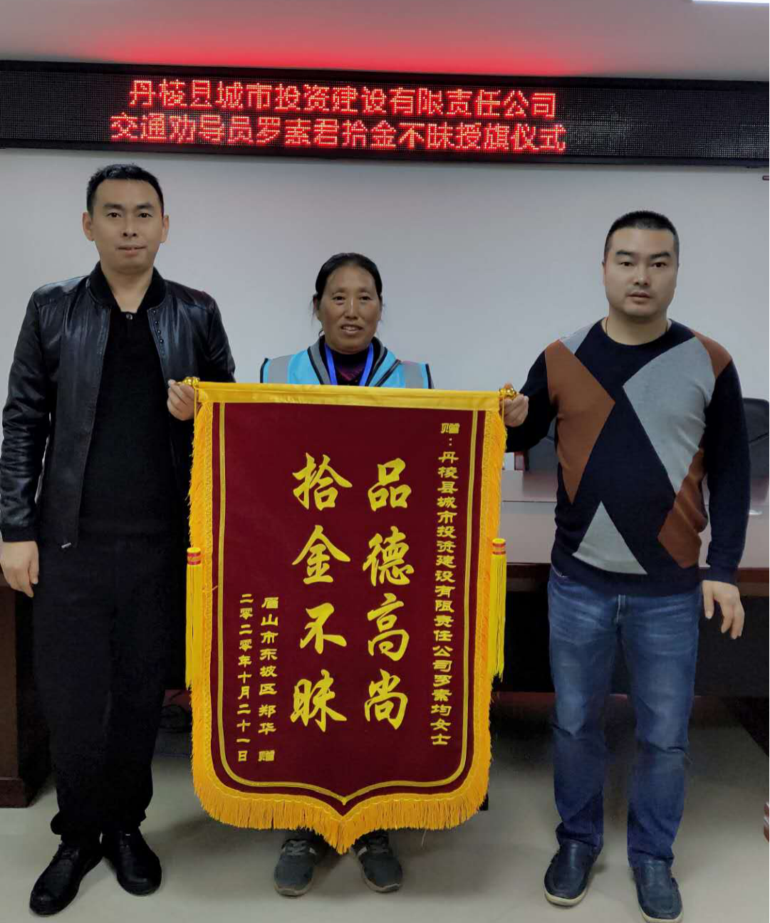10月20日傍晚,丹棱縣城市投資建設(shè)有限責(zé)任公司交通勸導(dǎo)員羅素君在南岸A區(qū)路邊停車位值守時(shí),撿拾到一個(gè)錢包,內(nèi)有約1000元現(xiàn)金、身份證、銀行卡、發(fā)票資料、保險(xiǎn)柜鑰匙、汽車鑰匙等重要物品。羅素君立即把此事上報(bào)公司并通過(guò)失主發(fā)票上的電話號(hào)碼聯(lián)系失主親手交還。